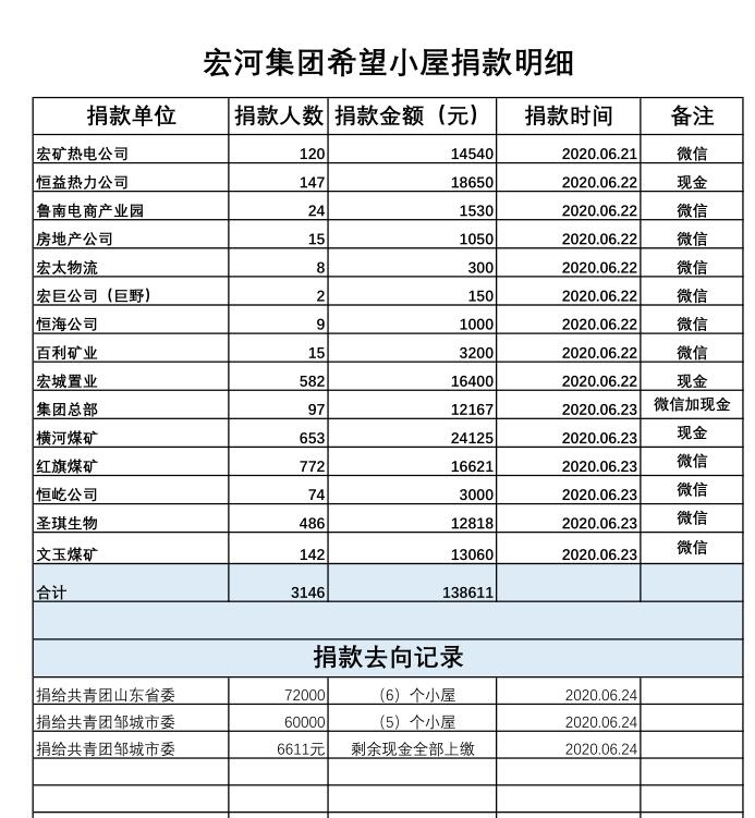 為幫助更多的適齡困境兒童實(shí)現(xiàn)夢(mèng)想,響應(yīng)山東團(tuán)省委、山東省青聯(lián)實(shí)施“希望小屋”兒童關(guān)愛行動(dòng)募捐倡議, 按照集團(tuán)黨委安排,集團(tuán)團(tuán)委組織動(dòng)員廣大干部職工踴躍捐款,齊心協(xié)力匯聚愛心傳遞對(duì)貧困兒童的關(guān)愛,為更多有需求的兒童奉獻(xiàn)愛心,幫助他們打造渴求已久的學(xué)習(xí)生活空間。 6月23日,共筑“希望小屋”,捐建逐夢(mèng)空間——宏河集團(tuán)“希望小屋”兒童關(guān)愛行動(dòng)募捐儀式,在集團(tuán)總部舉行。 據(jù)統(tǒng)計(jì),宏河集團(tuán)希望小屋愛心捐款活動(dòng)共籌集到愛心捐款:138611元。其中,捐款所得款項(xiàng)統(tǒng)一匯繳至共青團(tuán)山東省委、共青團(tuán)鄒城市委希望小屋工程項(xiàng)目,定向給鄒城市希望小屋項(xiàng)目建設(shè)。明細(xì)如下: 近年來,宏河集團(tuán)積極關(guān)注并致力于社會(huì)公益活動(dòng),通過黨、政、工、團(tuán)群體組織積極摸排協(xié)調(diào)并解決貧困職工家庭問題,特別是貧困殘疾人員家庭無獨(dú)立居住和學(xué)習(xí)環(huán)境孩子的教育問題。在以往金秋助學(xué)、愛心送考、精準(zhǔn)扶貧、慈心一日捐、抗疫捐款等工作及公益活動(dòng)中,集團(tuán)秉承“幸福員工、鑄就未來、服務(wù)社會(huì)、溫暖人間”的企業(yè)使命,主動(dòng)承擔(dān)社會(huì)責(zé)任,持續(xù)關(guān)心關(guān)注孩子們的生活和教育問題。希望通過此次為“希望小屋”的捐款,幫助更多孩子們健康成長(zhǎng)。 |