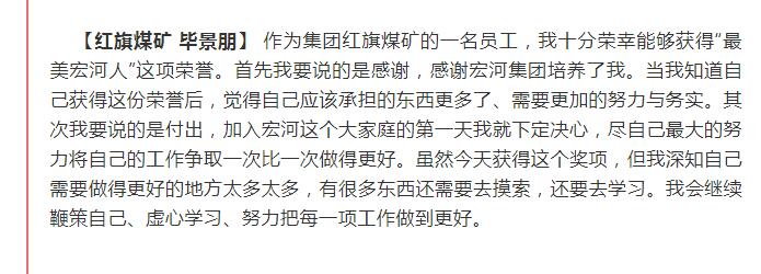 “集團(tuán)這次對(duì)2018年工作中涌現(xiàn)出來的勞動(dòng)模范、安全標(biāo)兵和愛崗敬業(yè)最美宏河人等先進(jìn)單位和先進(jìn)個(gè)人,進(jìn)行了隆重表彰。目的就是通過樹立一批扎根基層一線、踏實(shí)苦干實(shí)干的先進(jìn)典型,旗幟鮮明地告訴大家:集團(tuán)黨政始終關(guān)注在煤礦井上下愛崗敬業(yè)的職工,集團(tuán)黨政始終關(guān)注在公司車間班組基層一線愛崗敬業(yè)的職工,集團(tuán)黨政始終關(guān)注在不同崗位上辛勤工作、無私付出、愛崗敬業(yè)的職工?!?集團(tuán)黨委書記、董事長(zhǎng)張文,在大會(huì)講話中說。